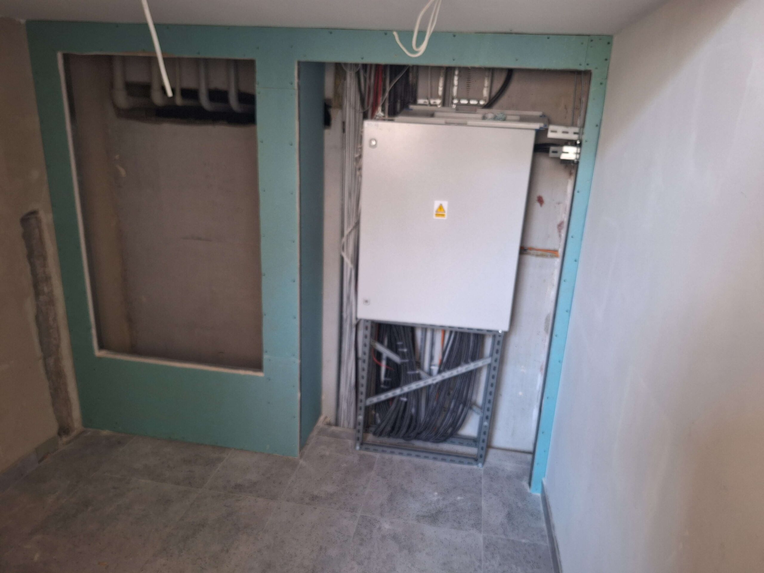 – Budynek B – 03.2026 rozpoczęcie montażu ścianek szaf licznikowych na klatkach schodowych, zabudowa szachtu instalacyjnego
